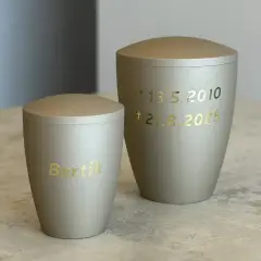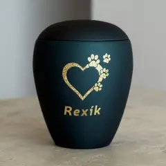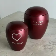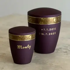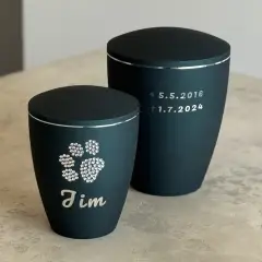 Pokud jste se rozhodli mít na vybrané urničce jméno, případně i datum narození a datum úmrtí zvířátka, máte možnost zvolit si toto provedení. V naší nabídce jsou základní samolepící štítky, které jsou v ceně urničky, speciální vyřezávané samolepící písmo zlaté nebo stříbrné a v neposlední řadě jméno sestavené z kamínků Swarovski.